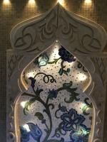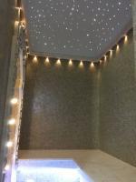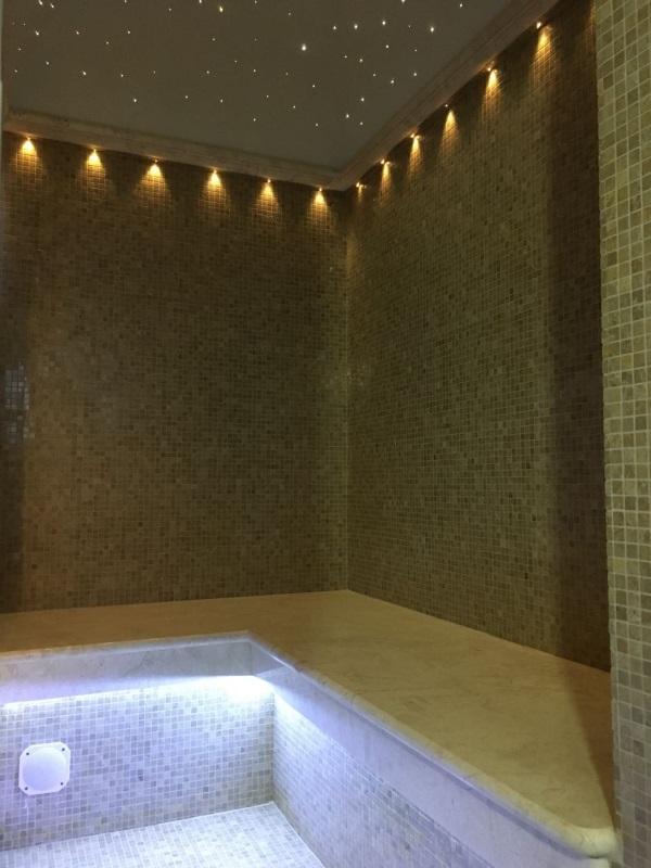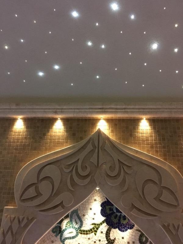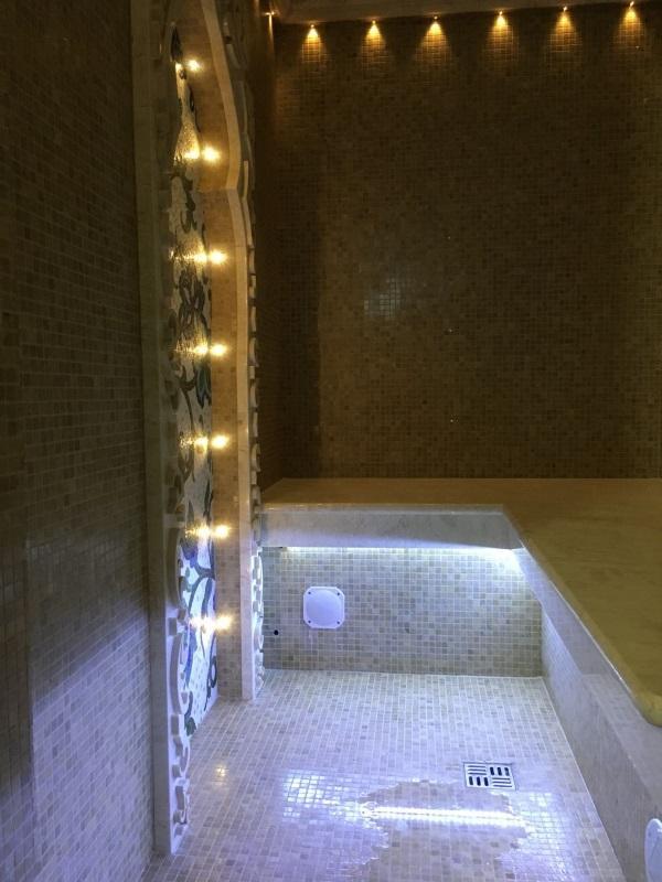 При изготовлении хамама особое внимание уделяется освещению, ведь освещение в хамаме - одно из главных нюансов создания настоящей Турецкой бани. Именно благодаря правильно подобранным светильникам, создается та незабываемая и волшебная атмосфера. Это невероятно красиво и помогает релаксации. В изготовлении хамама, мы использовали светодиодное ленточное освещение в сочетании со светильниками, что и создало настоящий восточный колорит звездного неба в алмазах.